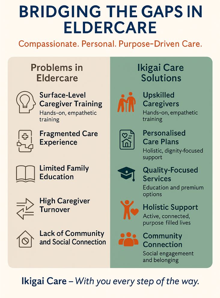 At Ikigai Care, we are committed to bridging the gaps in eldercare by delivering compassionate, premium-quality services that prioritise dignity, independence, and emotional well-being.